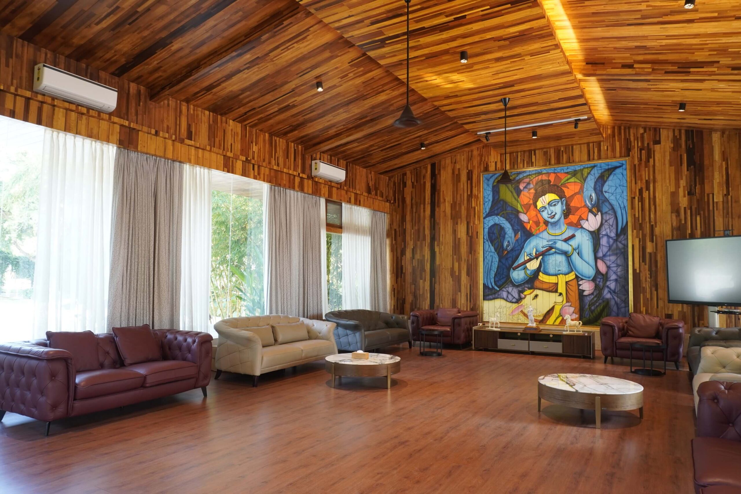 The majestic lady of nature, looking up trying to capture the whole universe inside of her as a piece of statement-worthy art was created in the Entrance Foyer. A much-needed respite of green midst a sandy landscape that surrounded the home. The breakout space, a minimalistic patch of green, deftly accentuates the interplay between light & shadows. This was created as a modern-day homage to traditional Indian homes and their open-to-sky plans.